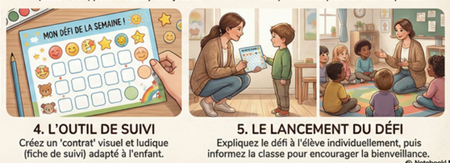 - Expliquer aux parents de l’élève ainsi qu’aux camarades de classe le défi lancé en les invitant à encourager l’élève concerné.