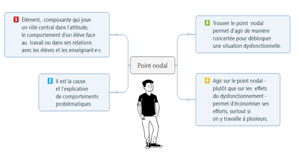 La première est la recherche du point nodal, concept théorisé par Pierre Vianin. Elle peut intervenir au palier numéro 2 de la réponse à l’intervention et consiste à interroger l’ensemble des activités d’un élève et de sa personnalité dans le but d’émettre une ou plusieurs hypothèses de causes de dysfonctionnements.